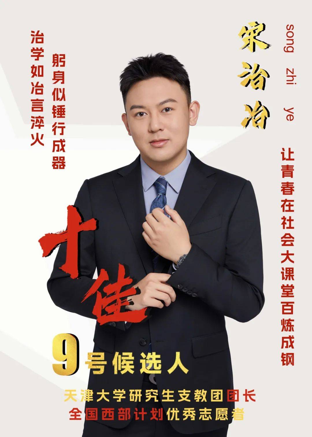 事迹精要:宋治冶,党员,管理与经济学部2024级硕士生,先后担任天津大学研究生支教团团长、校团委兼职团干部等15项学生职务,累计志愿服务时长超1000小时。相关事迹获中央电视台、共青团中央、中国青年报等媒体报道40余次,作为天津市青年代表登上新闻联播。推动云课堂、书信交流等10余项研支团品牌活动走深走实,担任学生负责人统筹教育部规划司数字支教、天津大学“乡村振兴”自主创新基金等重要项目,多次向杨贤金书记等校级领导汇报工作成效。深入4省7家企业开展10余次调研实训,1篇管理类中文顶刊外审中,获得2项专利授权,学术论文入选SCI1区TOP级期刊会议,作为核心成员参与国家重点研发计划等4项项目申报、结项工作。曾获全国大学生西部计划优秀志愿者、首届全国大学生新文科实践创新大赛全国金奖等荣誉50余项。