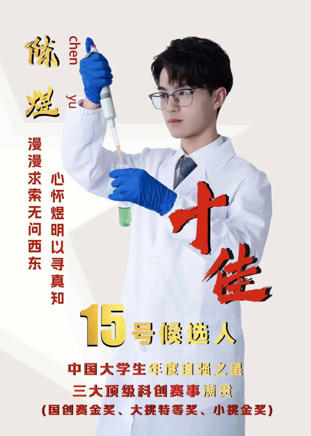 事迹精要:陈煜,机械学院2023级直博生,德智体美劳全面发展,综测排名1/168(各项均满分);参与“科技冬奥”、“中美超级卡车”等国家重大科研项目,赴韩国作学术报告,撰写SCI/EI论文7篇,专利9项;作为项目负责人主持完成2项国家级创新创业项目,获国创赛金奖、挑战杯金奖、挑战杯特等奖等国家级科创竞赛奖项10余项、省部级及以上科创荣誉30余项;担任天津大学团委青马教育中心主任、天津大学团委青年发展中心主任等职务20余项,组织超百人大型活动100余次,服务范围覆盖天大数万师生;多次赴贫困山区支教实践,累计志愿时长350余小时,为当地创收数万元;获中国大学生年度自强之星、天津市创新创业奖学金等荣誉100余项;相关事迹收录于“天大这十年”成果展,荣登天大官微10余次,被CCTV、新华社、人民日报等30余家主流媒体广泛报道。