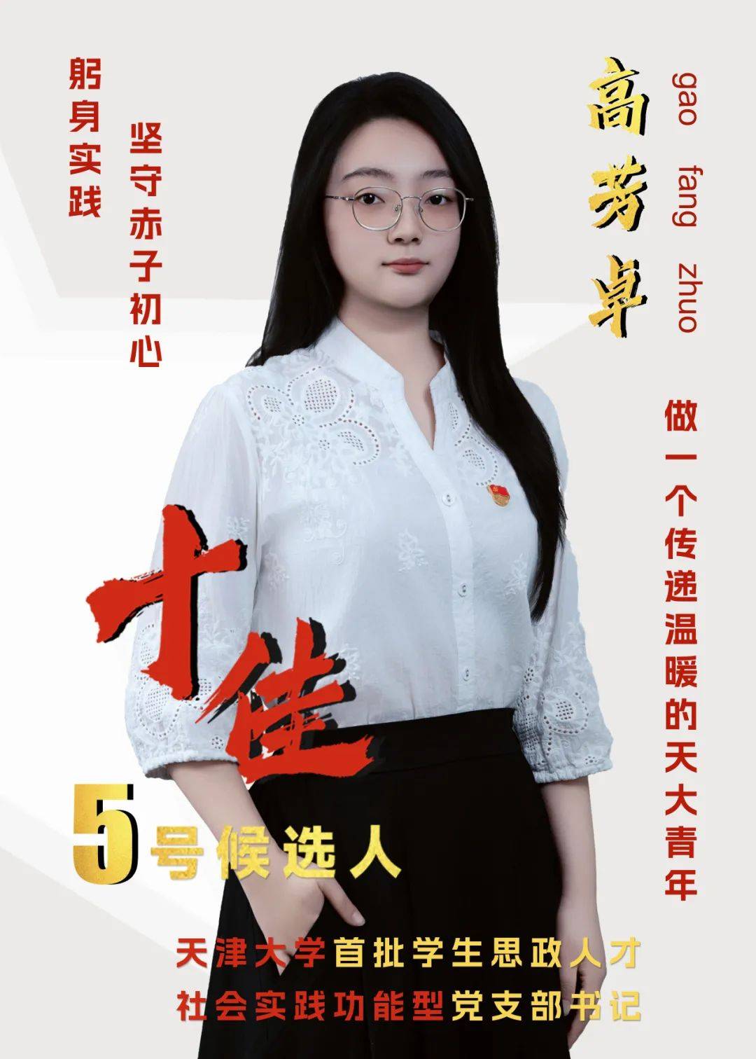 事迹精要:高芳卓,党员,智算学部2024级硕士生。现任首批天津大学学生思政人才、社会实践功能型党支部书记等。牵头成立“医路赞歌”实践队,与赞皇县委、教育局达成长期合作,首创天大“支教+支医”实践形式助力乡村振兴,2年即获全国榜样100优秀大学生团队等2项国家级荣誉、4项省部级荣誉以及10余项校级荣誉。从零组建话剧团,带领团队自编、自导、自演原创话剧《刘瑞恒》,获评第二届天津大学生戏剧节最高奖“精品原创单元一等奖”,展现天大医学文化底蕴。深耕医学影像方向,真正将“医学”与“工程”深度融合,1篇行业顶会论文在投。获国家奖学金、天津市社会实践活动先进个人(2次)、天津大学优秀共青团干部等校级及以上荣誉40余项。