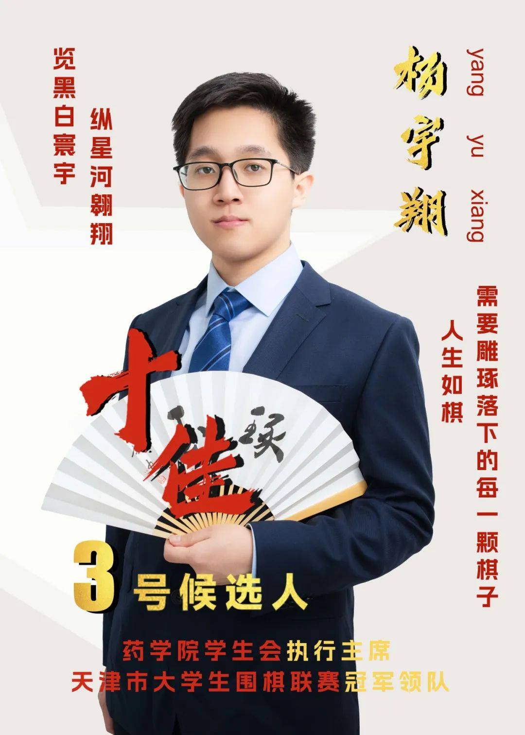事迹精要:杨宇翔,药物科学与技术学院2021级本科生,加权成绩和综测排名连续两年位列专业第一,曾获天津市人民政府奖学金、本科生国家奖学金医学部“十佳杰出青年”等近十项奖励荣誉,参与发表SCI论文两篇,其中一篇为独立第一作者,现已保研至清华大学生命科学学院攻读博士学位。曾任院学生会执行主席和校棋牌协会会长。带领院学生会开展活动十余项,获评“我为青年办实事”十佳活动项目、优秀院级学生会等多项称号。带领棋牌协会组织举办校内校际范围内十余项活动;开办“围棋思维与艺术”第二课堂并获金课评选一等奖;带队参加天津市大学生围棋联赛(总团体第一,2017年以来首冠)等多项棋类赛事均取得优异成绩;获评十佳社团、十佳社团活动案例、先进集体等多项荣誉。