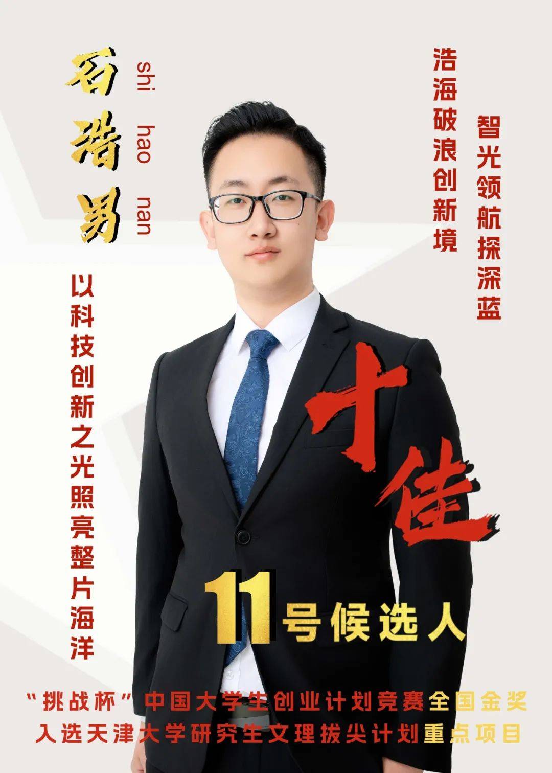 事迹精要:石浩男,党员,海洋学院2022级博士生,深耕海洋探测技术,开发新体制水下激光雷达系统,解决海洋中“看不见、看不清、看不远”的问题。相关成果发表SCI论文10篇(一作/共一5篇,通信1篇),公开专利4项,综测位列专业第一,曾获天津大学学生科学奖、天津大学三好学生等10余项荣誉奖项。同时投身于创新创业事业,响应“海洋强国”号召,创立“精维探海”项目,首创水下声光一体化探测新模式,实现多维度、精细化的海洋探测。项目成果获“挑战杯”创业计划大赛全国金奖、中国国际创新大赛全国铜奖等荣誉,受到马来西亚驻华大使馆参赞高度认可。注重全面发展,参加相声社团演出20余次,创编多段相声节目,并积极参与社会实践与志愿服务,多次进行科普讲座。