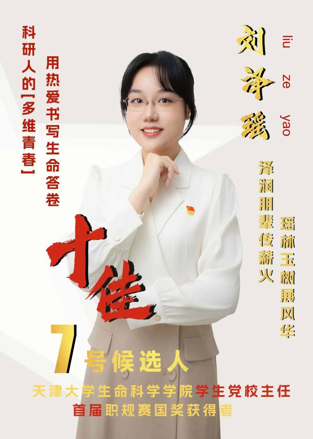 事迹精要:金丽果,党员,材料学院2021级博士生,获批中国科协青年人才托举工程博士生专项(国家级青年人才项目)。构建可实现临床转化应用的微波响应复合材料,解决目前临床治疗细菌感染性骨髓炎的痛点问题。在校期间共发表SCI论文24篇,以第一作者发表SCI论文10篇。其中博士期间共发表SCI论文18篇,以第一作者发表SCI论文7篇(均为影响因子10分以上的Top期刊),入选ESI高被引论文1篇,封面论文1篇。曾获3次国家奖学金(本硕博)、宝钢优秀学生奖学金、天津大学优秀学生标兵、中国大学生自强之星奖学金等奖励及荣誉50余项,志愿服务总时长累计289小时。在抖音平台分享阅读文献和论文写作等科研知识,粉丝量4.2万+,单条视频最高播放量320万+。