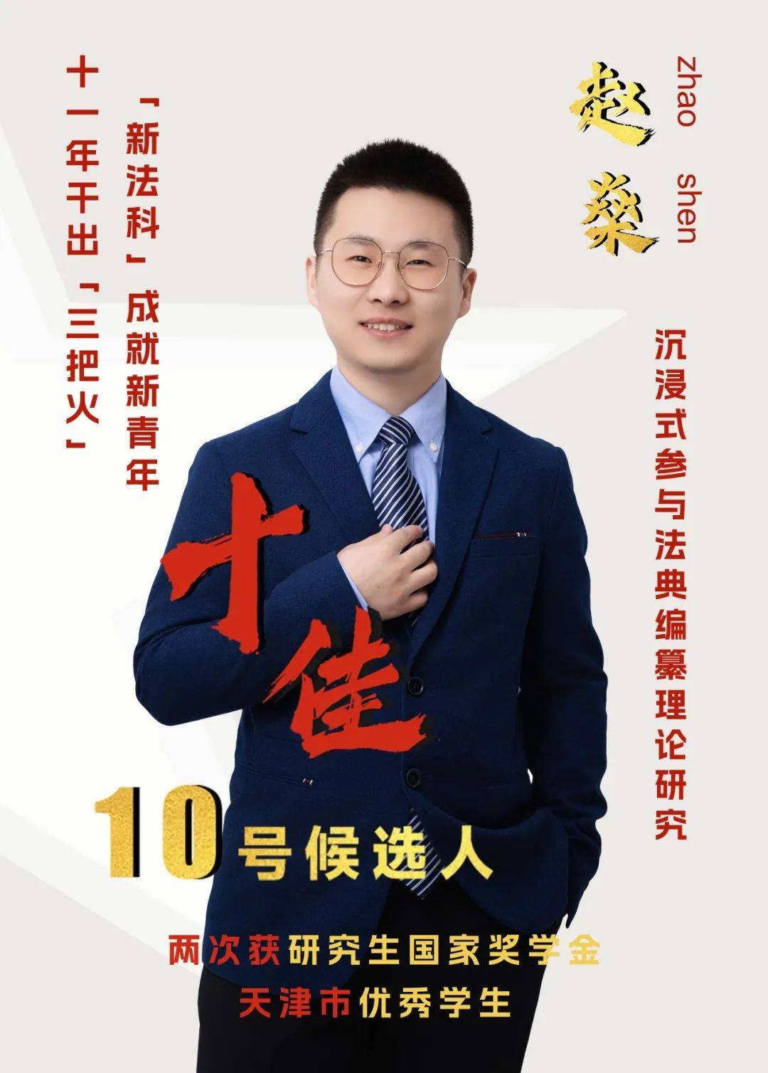 事迹精要:赵燊,党员,法学院2022级博士研究生,取得法律职业资格A证。担任天津大学中国绿色发展研究院助理研究员、2022级法学博士班班长,曾任数学学院辅导员等职务。目前,共计发表论文7篇,其中CSSCI来源期刊论文2篇,CSCD来源期刊论文1篇,获环渤海区域法治论坛二等奖、全国环境法博士生论坛优秀论文(全国10人)等多项科研奖励。深度参与包括国社科基金重大项目等在内的科研项目近20余项。编著出版书籍5部。撰写咨政要报4篇,获中央和天津市有关部门采纳,其中2篇获国家有关部门肯定,并获中国法学会向校发函表扬。沉浸式参与国家顶层立法工作。获国家奖学金(2次)、天津市优秀学生、天津大学优秀共青团干部等校级以上奖项荣誉10余项。