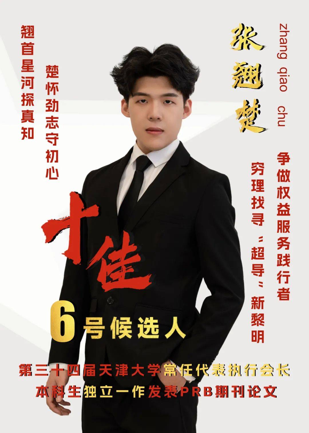 事迹精要:张翘楚,理学院2021级本科生,加权综测连续三年全系第一,获三年国家奖学金,面试第一获国际理论物理中心(亚太地区)直博offer,获物理所严济慈奖学金、高能所钱三强奖学金,天津市优秀学生、优秀共青团干部、优秀共青团员等十余项荣誉。获创业世界杯数字科技赛道冠军,互联网+全国季军、互联网+市赛冠军金奖、物理学术竞赛一等奖、北洋杯数学竞赛一等奖等十余奖项,本科期间致力于超导理论研究,发表两篇学术论文,一篇一作发表至PRB,一篇投稿于arXiv。加盟哈希碰撞创业团队,任X-way团队平台导师,作物理学金牌讲师。曾任天津大学学生会负责人,院学生会执行主席、天津大学常任代表执行会长等十余项学生工作,院内作学业讲师。连任应用物理学班长,带领班级获“五四红旗示范团支部”“优秀团日活动”等系列奖项。连续两年回访母校实践队队长,志愿时长近三百小时。