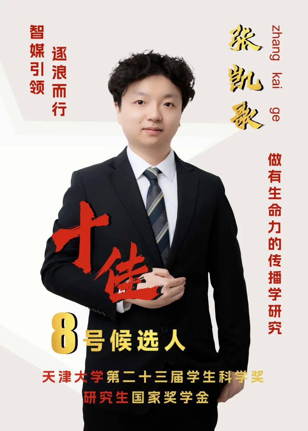事迹精要:张凯歌,党员,新媒体与传播学院23级硕士生,学业成绩、综合成绩均为专业第一,围绕“数字中国”发展布局以及智能技术与社会、媒介基础设施等前沿议题,以导师一作、本人二作发表(含录用)核心期刊7篇,其中SSCI/SCI 1区论文3篇,CSSCI论文2篇,CSSCI扩展版论文1篇。成果累计被引超130次,3篇次入选ESI热点/高被引论文。成果发表于Journal of Retailing and Consumer Services (SSCI 1区 中科院TOP期刊 IF=11.0)、Telematics and Informatics (SSCI 1区 中科院TOP期刊 IF=7.6)、《中国出版》(CSSCI期刊)、《北大新闻与传播评论》(CSSCI集刊) 等高水平期刊,论文在中国新闻史学会理事大会、第三届中国数字新闻学年会等会议宣读。曾获国家奖学金、天津大学学生科学奖等重要荣誉。